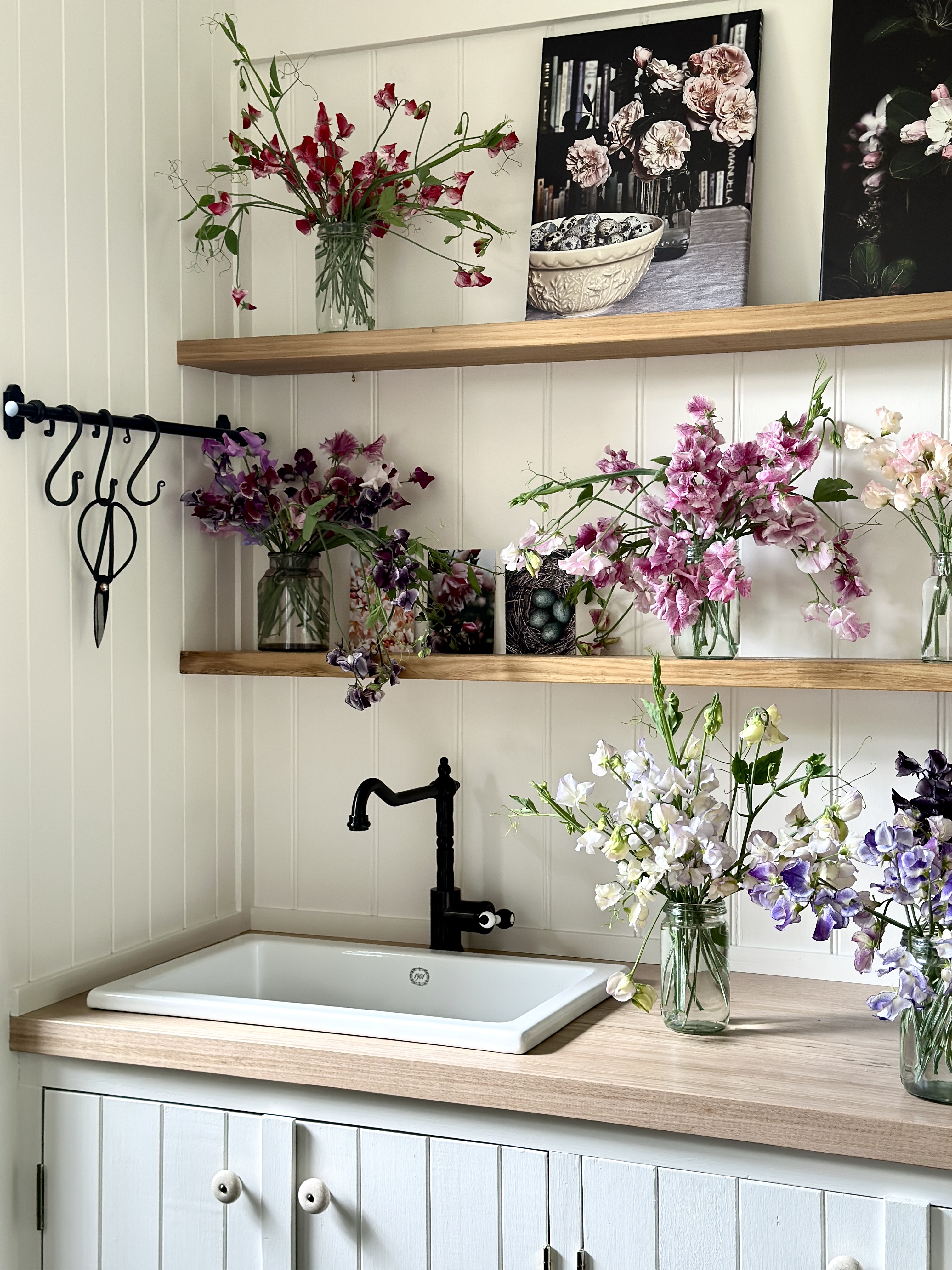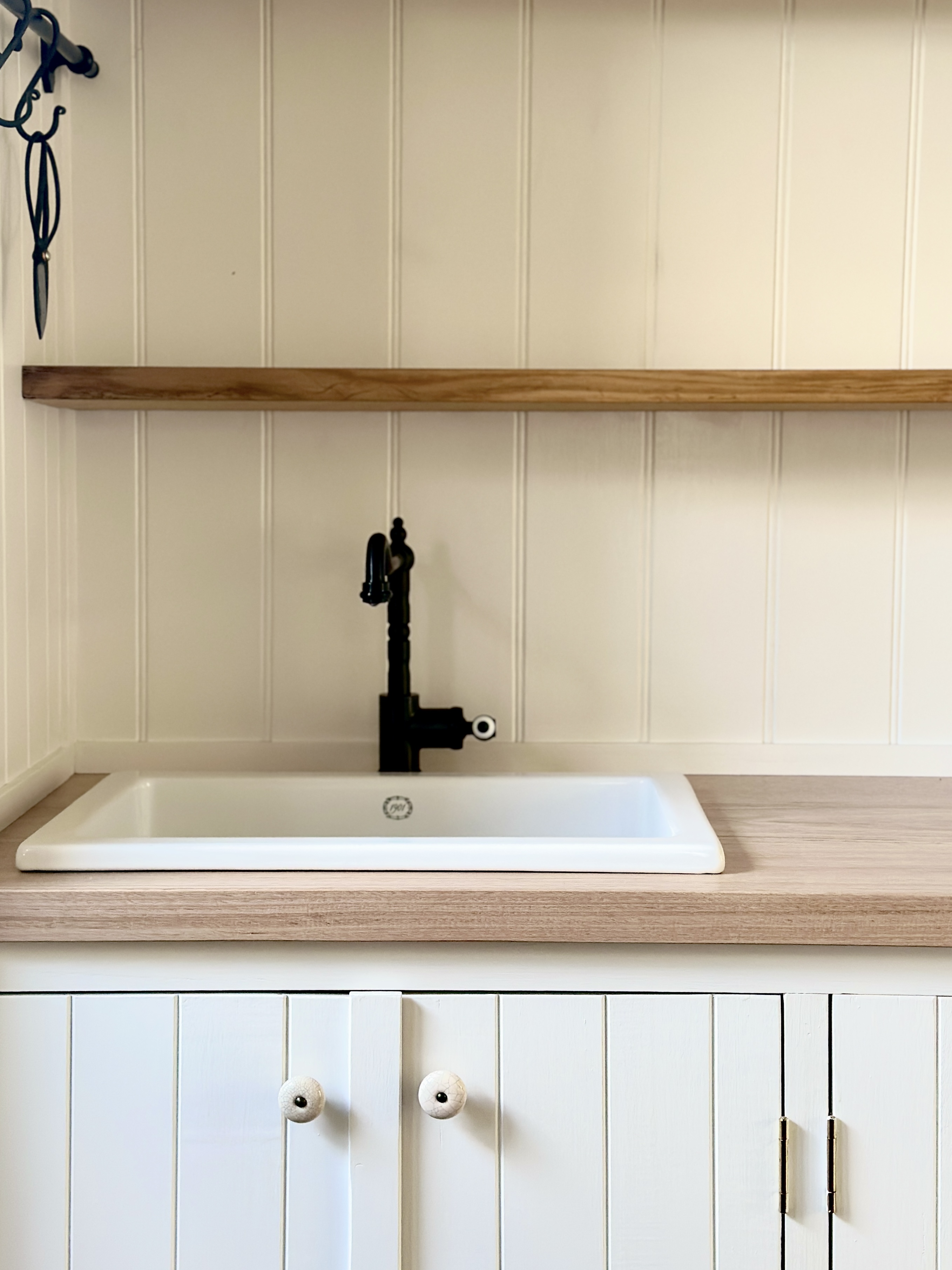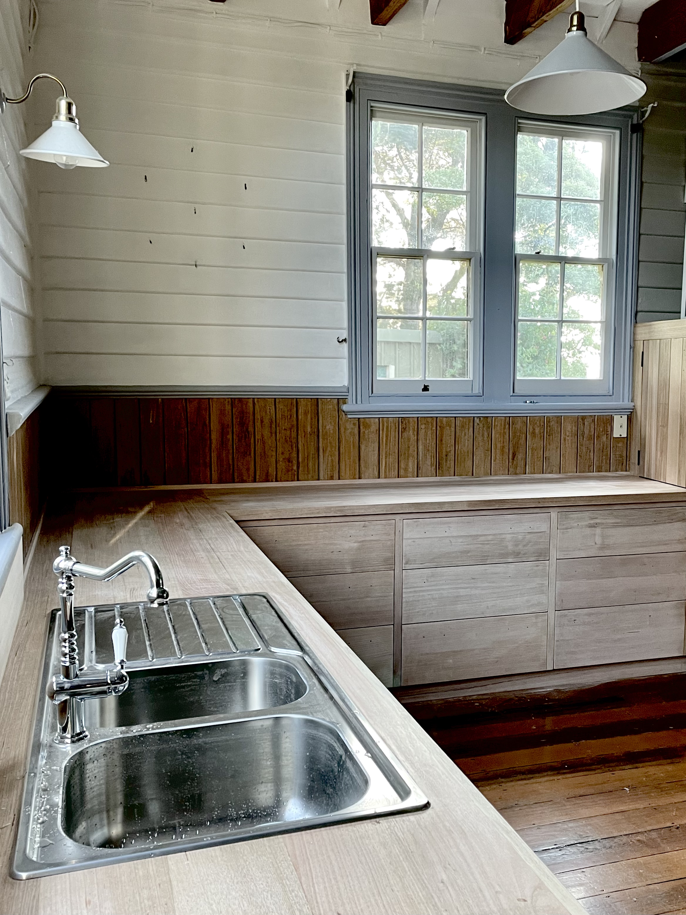 Photos: Australian company 1901 Fireclay Inset sink. Tasmanian Oak bench top, wall panelling and cabinetry made and installed by me.