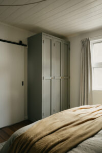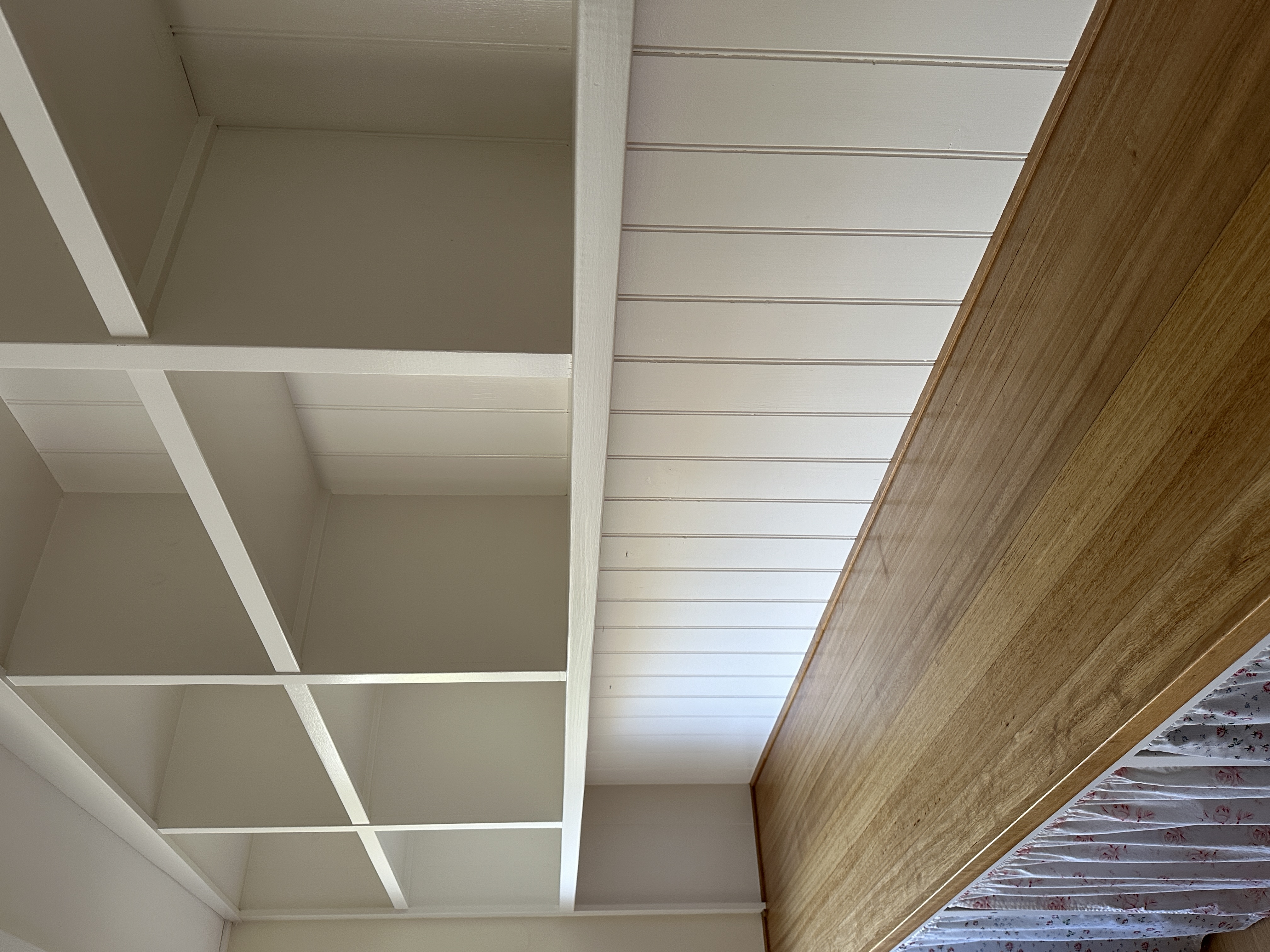 Tasmanian Oak bed, cabinetry, wardrobe and floorboards. Pine lining boards. All made and/or installed by me.