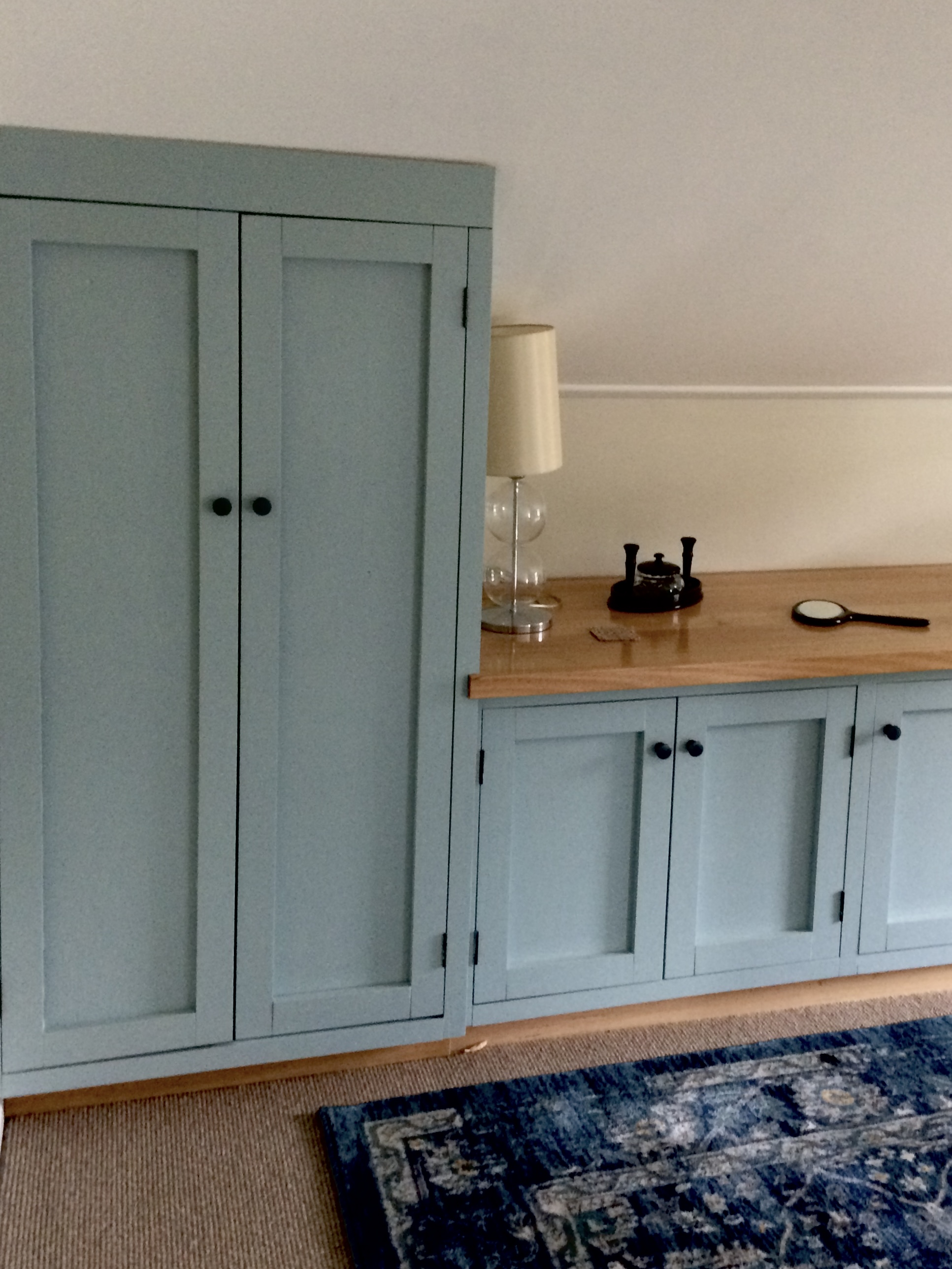 Attic room custom made cabinetry, bench top and wardrobe. Client design. Made and installed by me.